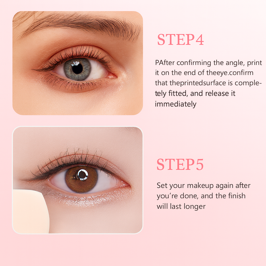 Start with the stamp end on clean, dry eyelids. Position the stamp at the outer corner of your eye at your desired angle, press gently for 1-2 seconds, then lift. Use the precision liner end to connect the stamp to your lash line and fill in any gaps. Let dry for 10 seconds before blinking.